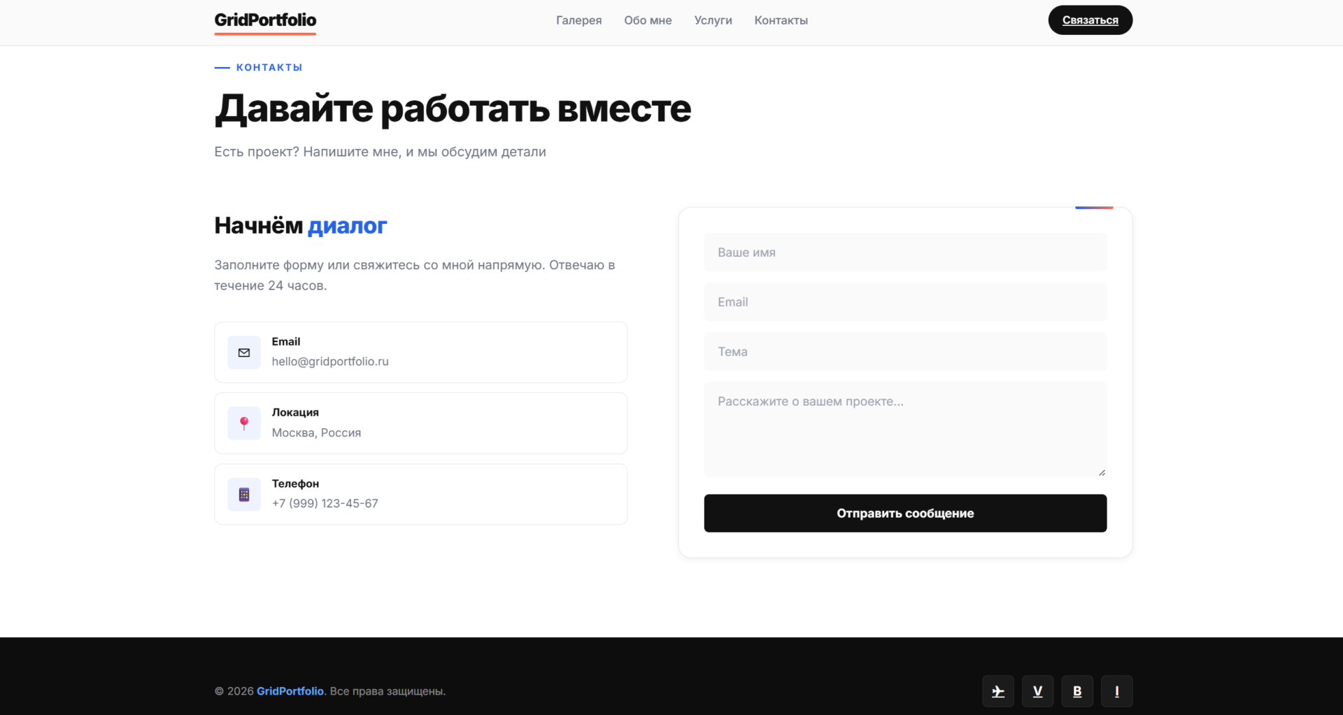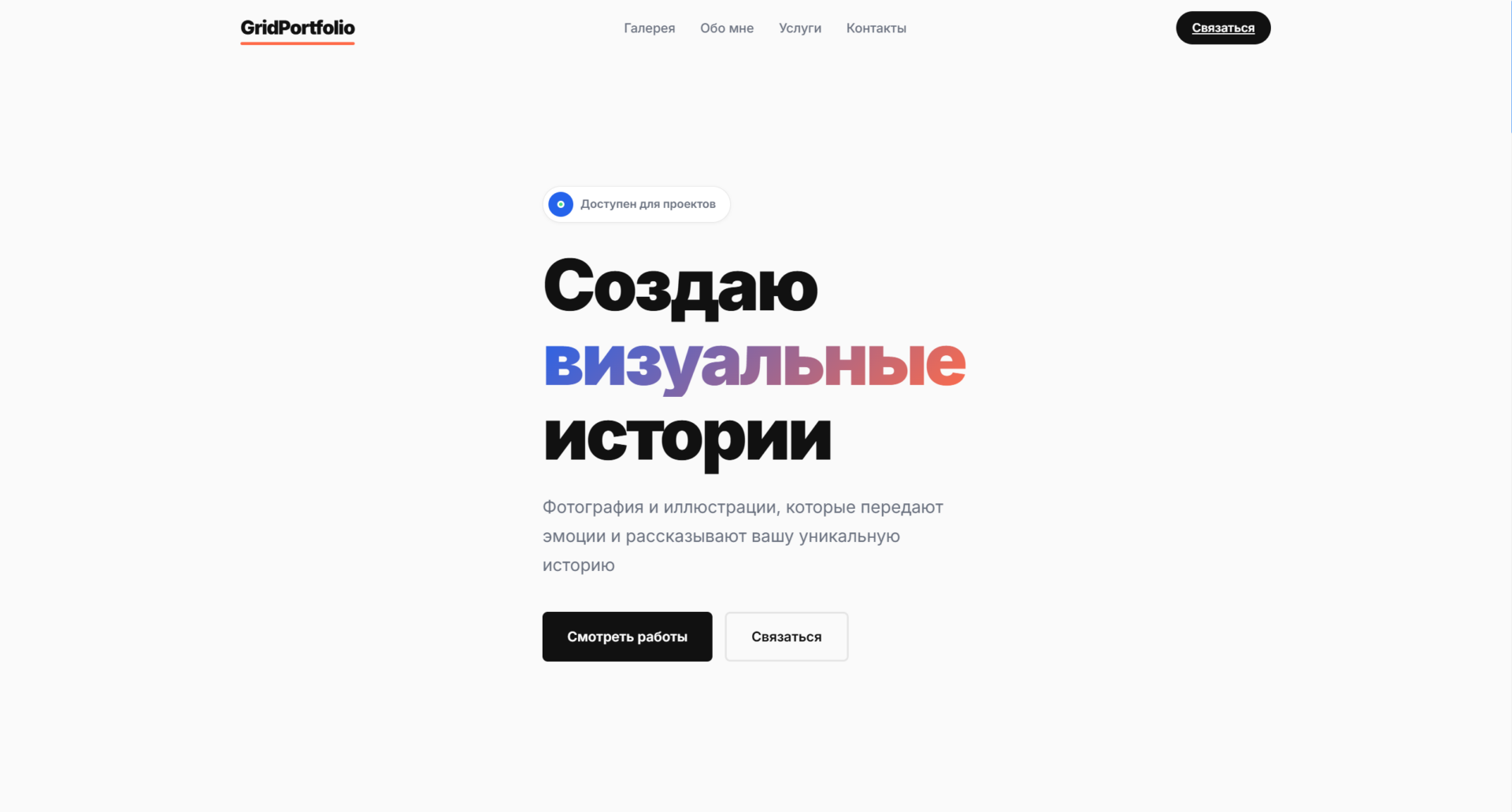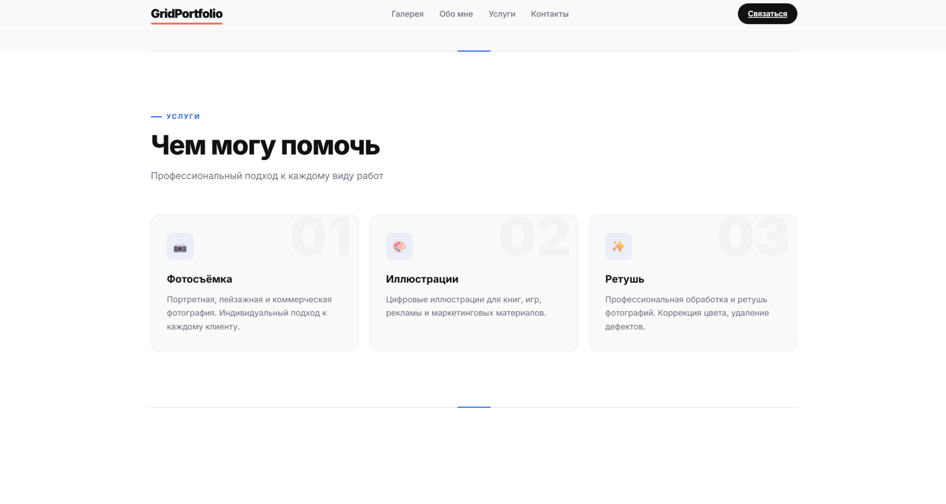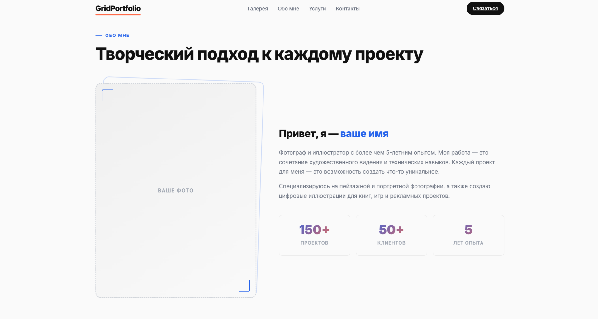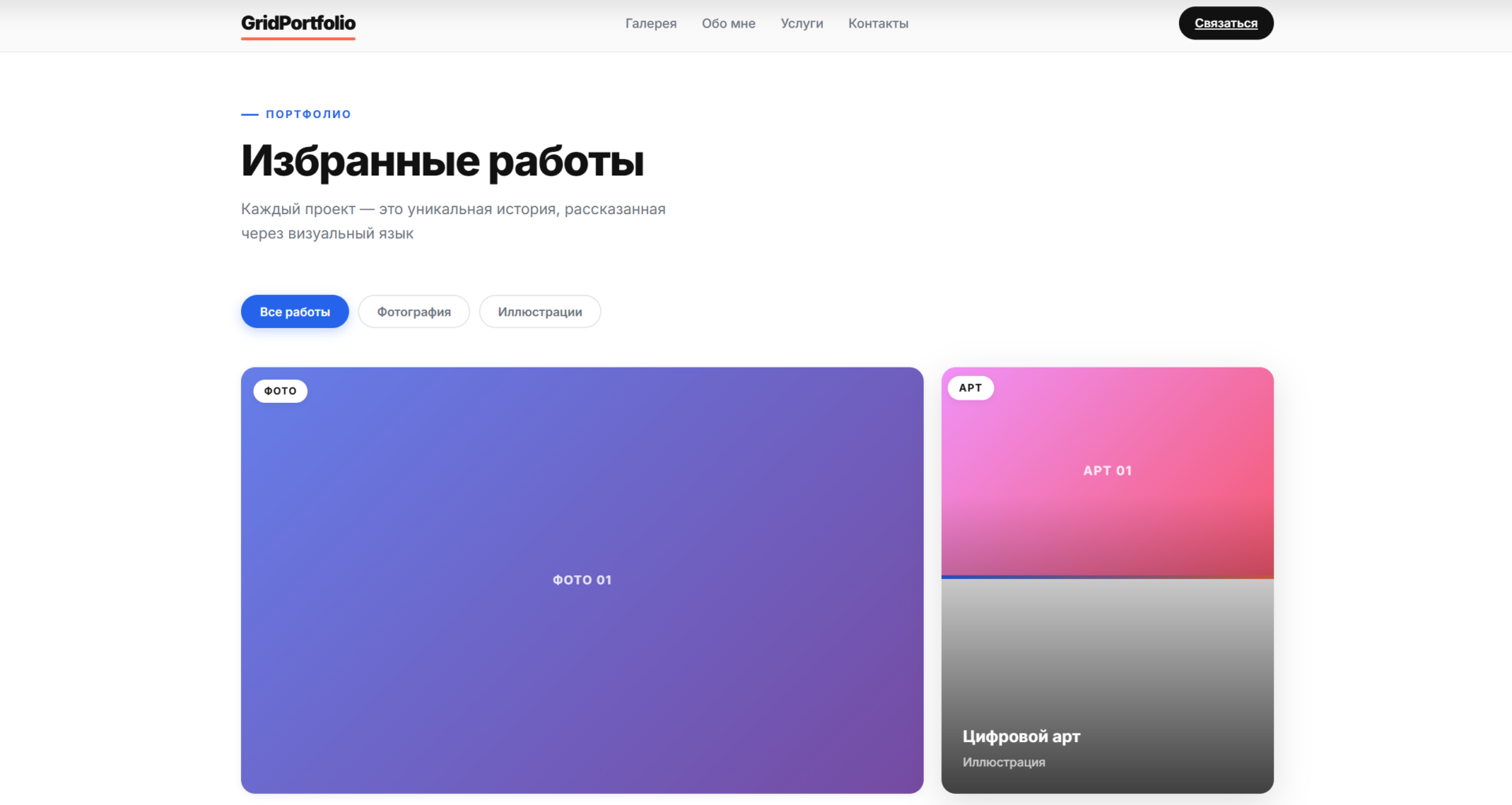 Шаблон Grid Portfolio с гибкой сеткой проектов — идеальное решение для демонстрации портфолио. Минималистичный дизайн, адаптивная вёрстка и интерактивные элементы помогут эффектно представить ваши работы. Легко настроить и запустить: чистый код на HTML, CSS и JavaScript.